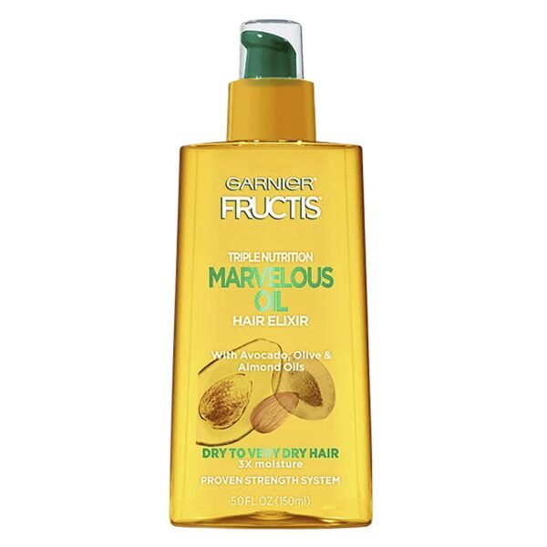 Multi-use Fructis Triple Nutrition Marvelous Oil Hair Elixir instantly delivers 72 hours of nourishment and glow with 450 degree F heat protection to treat dry to very dry hair without greasiness. Get up to 72 hours of nourishment and glow with system of shampooconditioner, and leave-in oil.